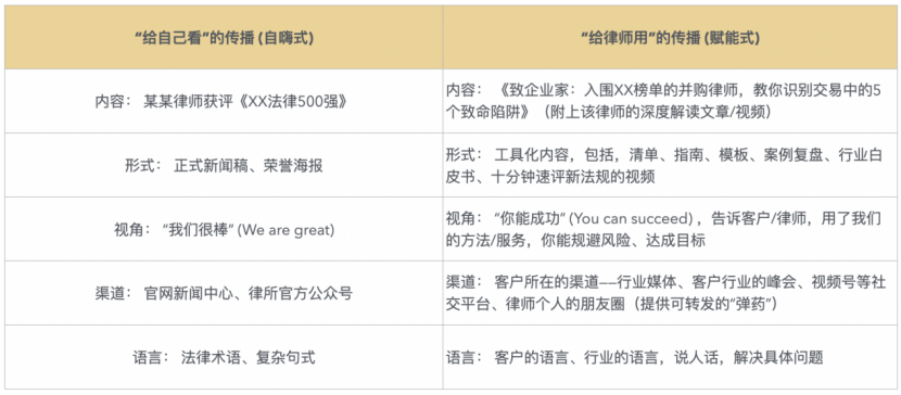 内部视角的内容充斥着头衔、荣誉、行业黑话(如“非诉业务”、“合规解决方案”),客户不关心你有多少位“高级合伙人”,他们只关心“我的投资协议你能不能看出风险?”。传播需要切入客户场景。