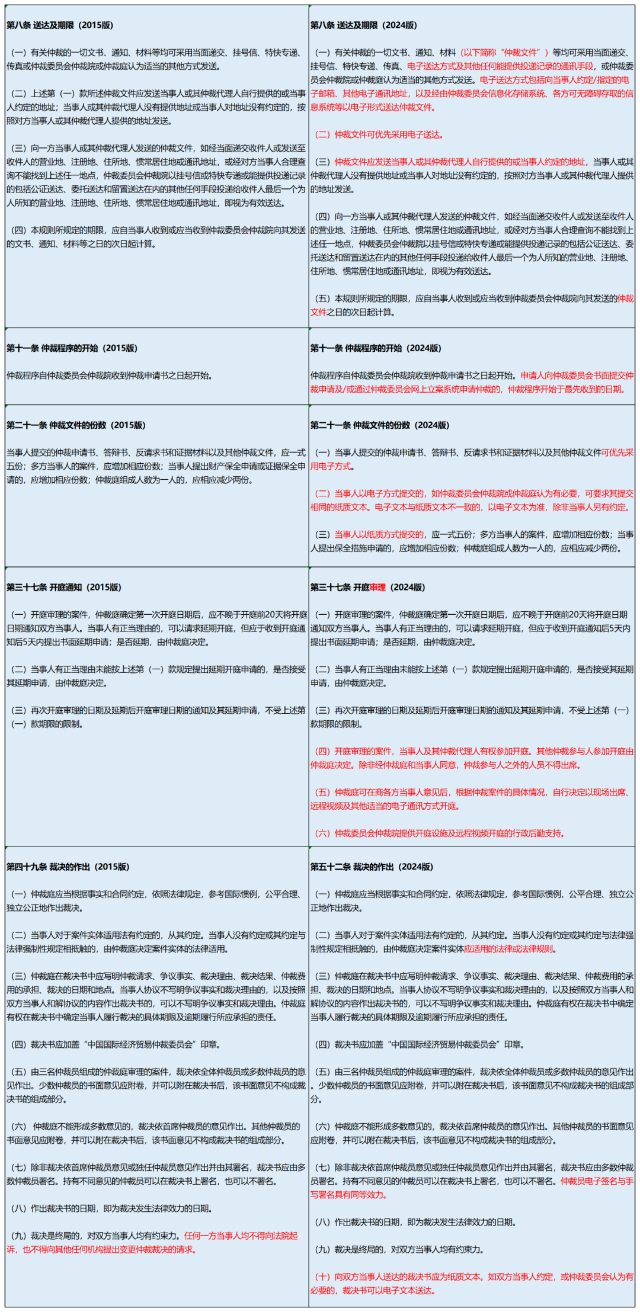 2024版新规第二十一条规定,当事人提交仲裁申请书、答辩书、反请求和证据材料等仲裁文件可优先采用电子方式提交,贸仲或仲裁庭认为有必要的,可要求提供纸质文本,电子文本与纸质文本不一致的,以电子文本为准。在我们之前代理的贸仲案件中,当事人均书面表示同意的情况下,电子提交材料的方式通常才被允许,但本次规则修改后明确了使用电子方式提交文件的优先性。