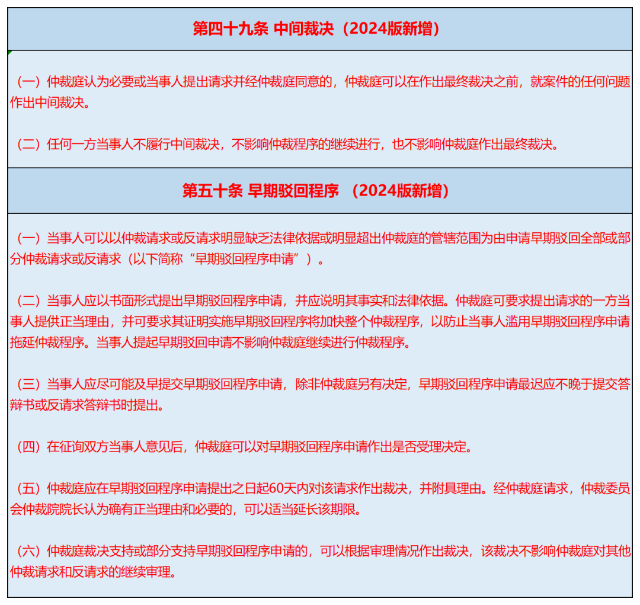 2024版新规增加了仲裁庭可作出中间裁决的规定。第四十九条规定,仲裁庭可以在最终裁决作出之前,就任何问题作出中间裁决,当事人不履行中间裁决的,不影响仲裁程序继续进行,也不影响仲裁庭作出最终裁决。
