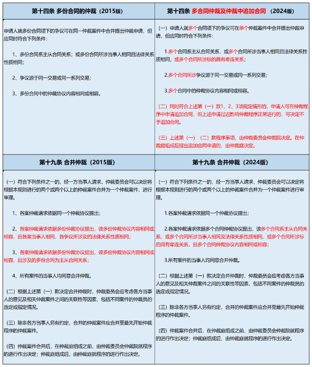 2024版新规第十四条规定,多个合同项下的仲裁请求可在单个案件中合并提出,本次修订增加了一种合并情形,即当“多个合同所涉标的具有牵连关系”时,当事人有机会将多个合同项下的仲裁请求合并在一个案件中提出,前提是多个合同源于同一或同一系列交易且多个合同的仲裁协议相同或相容。
