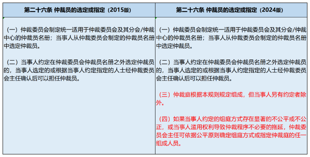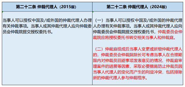 2024版新规第二十二条新增第(二)款规定,仲裁庭组成后当事人变更或新增代理人的,可能导致仲裁庭成员产生新的利益冲突的情形,此时,贸仲将综合考虑当事人之前对仲裁庭成员发表的回避意见、案件审理进度等因素,必要时排除新的仲裁代理人参与仲裁程序。