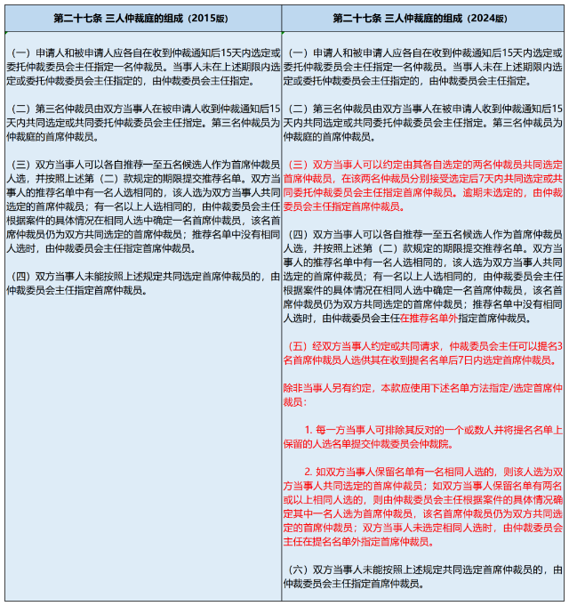 2024版新规第二十七条第(三)款规定,双方可以约定由其各自选定的“边裁”共同推选首席仲裁员、或共同委托贸仲指定首席仲裁员。该修改是此次规则的一大亮点。例如ICC等国际主要仲裁机构大都有类似规则。