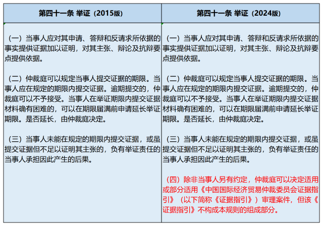 2024版新规在第四十一条第(四)款规定,除非当事人另有约定,仲裁庭可以决定适用或部分适用《证据指引》审理案件,但《证据指引》不构成2024版新规的组成部分。