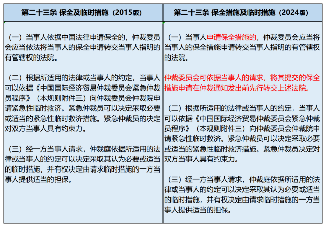 2024版新规第二十三条较原规定扩大了贸仲转递保全申请材料的法院范围。原规定仅规定,当事人依据中国法律申请保全的,贸仲应当将保全申请转递至有管辖权的法院。在修改后的规则下,保全不局限于中国内地法院,只要当事人申请保全,哪怕是向域外法院申请,贸仲也可以将保全申请转递至相关法院。