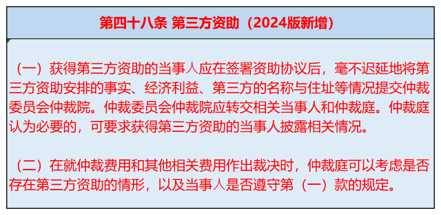 2024版新规第四十八条规定,获得第三方资助的当事人应在签署资助协议后,将第三方资助安排的事实、经济利益、第三方的名称与住址等情况向贸仲披露,由贸仲转交其他当事人和仲裁庭,仲裁庭认为有必要的,可要求获得第三方资助的当事人披露相关情况。