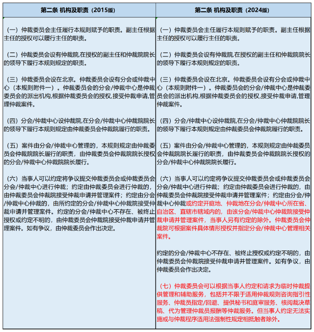 因此,此次贸仲2024版新规明确规定可为临时仲裁提供管理和辅助服务,“包括并不限于适用仲裁规则咨询指引性服务、仲裁员指定/回避、提供秘书和庭审服务、核阅裁决草稿、代为管理仲裁员报酬等仲裁服务”,无疑扩大了仲裁服务的范围,为仲裁用户提供了更多选择(特别是涉外仲裁的当事人)。
