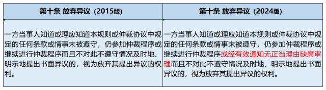 2024版新规第十条规定,如果当事人一方经有效通知缺席审理且不提出书面异议,视为放弃对仲裁协议或仲裁规则未被遵守而提出异议的权利。我们理解,该规则体现了诚实信用原则,一旦当事人构成放弃异议的情形,便难以在撤裁程序中主张不存在仲裁协议或仲裁规则未被遵守。
