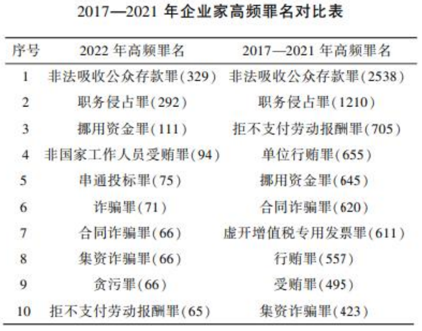 挪用资金犯罪一直是企业高管的重灾区,根据北师大中国企业家犯罪预防研究中心制发的2023企业家刑事风险分析报告(2022暨2017—2021数据对照分析)显示挪用资金罪从2017年至2022年一直位列第三位(如下图)。